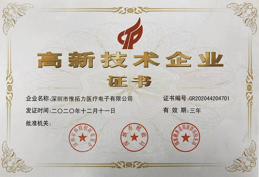 As the new year of 2021 is approaching, Shenzhen Witleaf Medical Electronics Co., Ltd. is pleased to receive good news: according to the relevant provisions of the national "administrative measures for the recognition of high tech enterprises" and "guidelines for the recognition and management of high tech enterprises", the company has been recognized as a national high tech enterprise, and has been officially awarded the "national high tech enterprise" certification, and the company has been officially listed in the national high tech enterprise certification New technology enterprises.