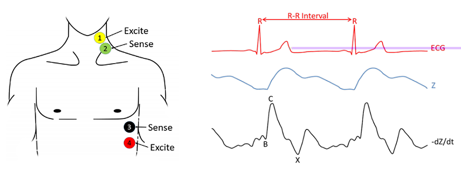 The impedance cardiography (ICG) and electrocardiogram (ECG) by using 4 electrodes, with one pair injecting a constant current, and a second pair of electrodes measuring the resulting voltage. The ICG signal represents the changes of the thoracic impedance due to variations in the blood flow. In practice, the raw Z signal is transformed into the –dZ/dt waveform by using the first derivative to remark the inflection points of the raw Z signal. This signal is post-processed to increase its quality.