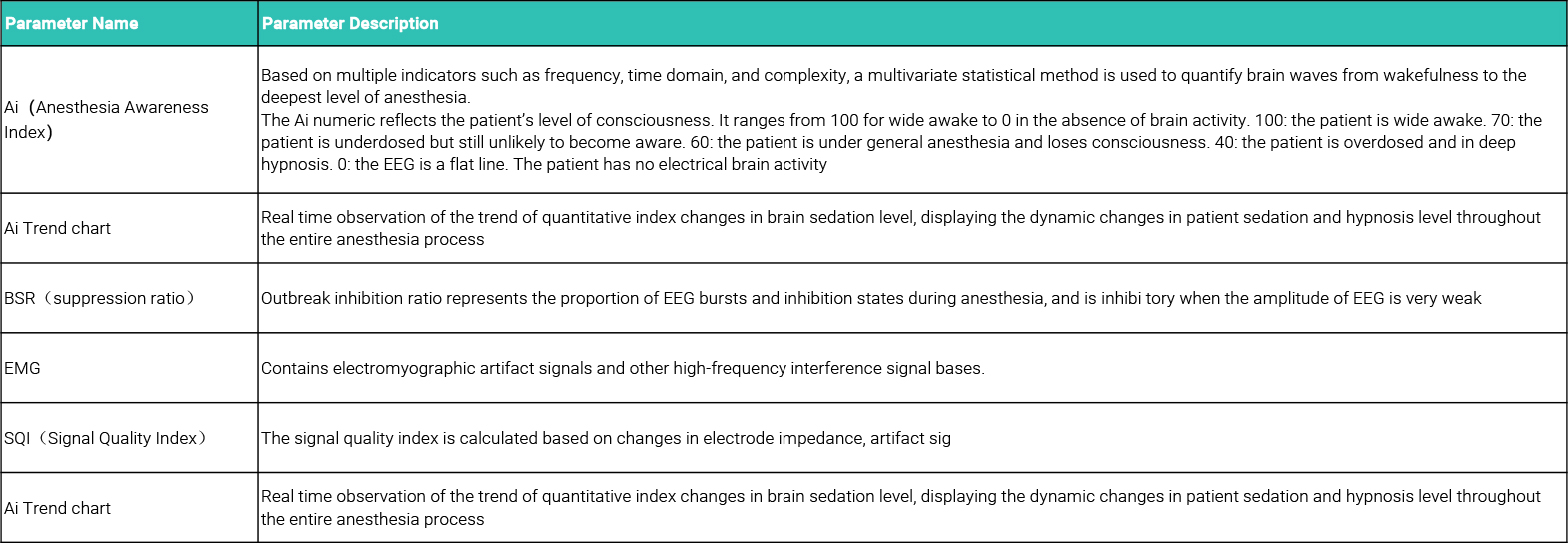Ai measurement technology has a special positive parameter calculation function. Through the time domain calculation and spectrum analysis of EEG signal, the signal quality index, EMG power and outbreak suppression ratio are calculated through the judgment of signal quality.