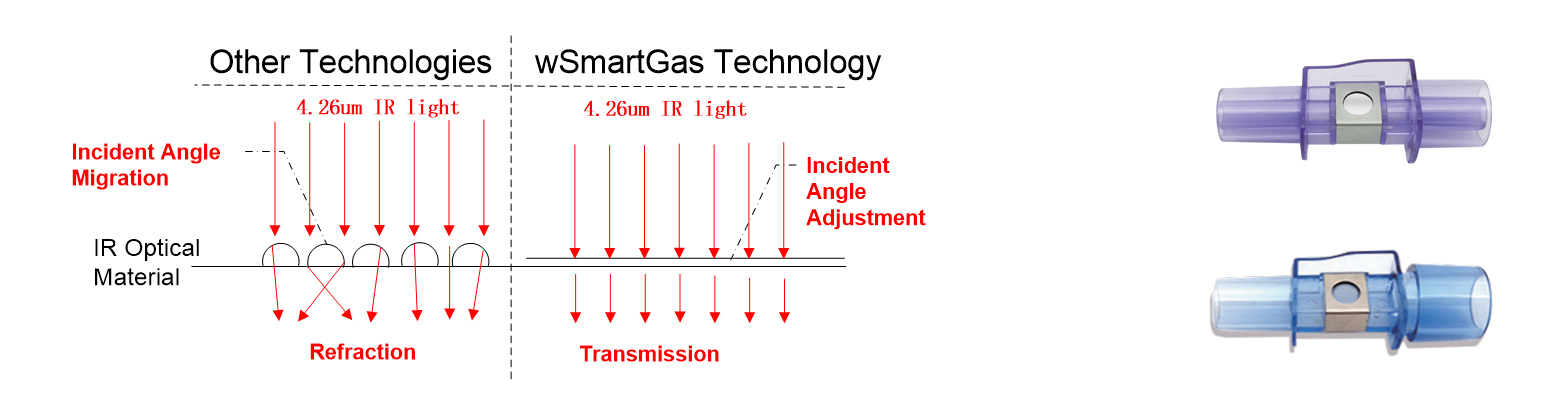 The breathing gas of the human body is saturated with water vapor, when the ambient temperature is low, for the mainstream EtCO2 measurement, it will condense on the surface of the measuring gas chamber to form water droplets, resulting in the scattering of infrared light through the measurement chamber resulting in overestimation of EtCO2 concentration, wSmartGas® through CapnoSET® mainstream airway adaptor technology by adjusting the incidence angle of IR light incidence surface to avoid the scattering of IR light in the penetration measurement air chamber to ensure the accuracy of measurement;