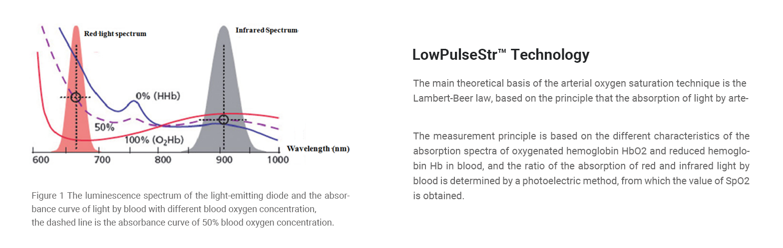 LowPulseStr™ arterial oxygen saturation technology is a proprietary technology that combines time domain recognition algorithms, frequency domain recognition algorithms, and a proprietary algorithm to make integrated decisions about measurement results. It is capable of providing accurate measurements in a weakly perfused and moving state.