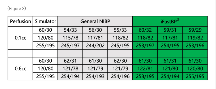 From the picture 3 and the table we can find that the iFastBP® system can let us benefit more than the general method, especially in the neonate monitoring that more easier to meet the simulated condition.