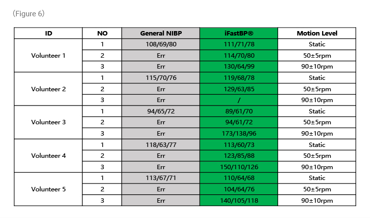 iFastBP® system is equipped with the real-time algorithm and frequency algorithm together. During NIBP measurement these two algorithms work parallel which can make the measurement more reliable and keep the accuracy if there is noise.If the iFastBP® system finds that there is arterial pulse missing or abnormal the frequency method will start to compensate the arterial pulse to get a completed arterial pulse for determining the blood pressure.With this advantage feature the iFastBP® system can get reliable and accurate blood pressure readings which is very useful for bedside monitoring,remote monitoring, SPOT checking,Monitoring during movement and neonate monitoring. Tested together with the general method iFastBP® system get better clinical feedback, shown as follows:
