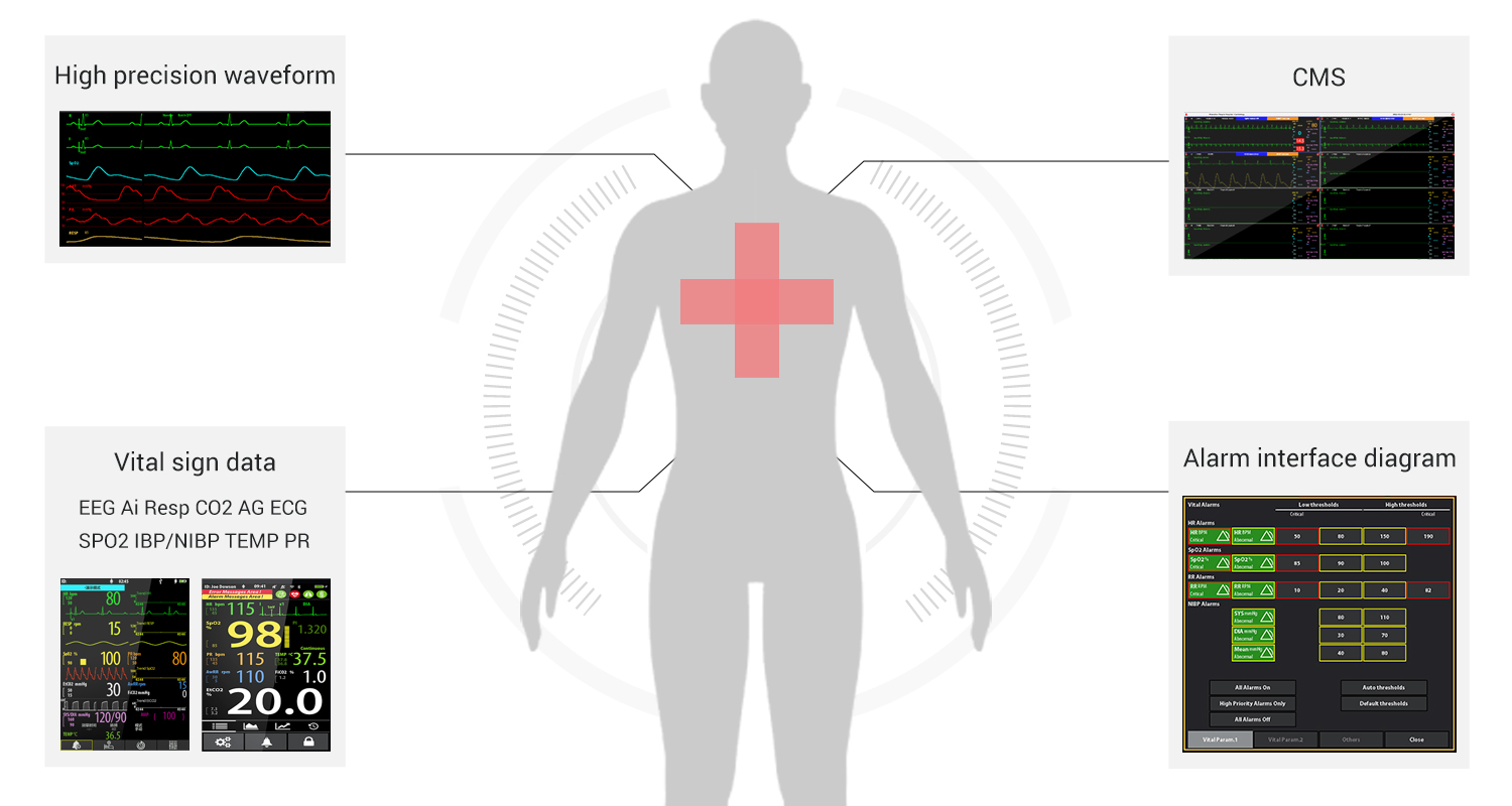 The central monitoring system data management center provides a variety of data protocol interfaces, which can flexibly communicate with the hospital information system, simplify the work process and assist doctors in diagnosis while ensuring the security of patient data.