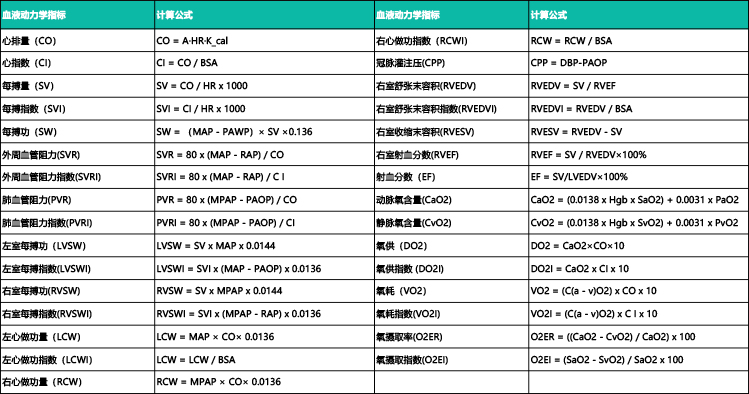 具备强大丰富的参数计算功能,全套血液动力学参数中,除了直接测定的参数指标之外,可以通过病人的信息和直接测定参数综合计算而得到更多更详细的血液动力学参数指标。参数指标的计算方法是参考爱德华公司推出的《Edwards Critical Care Education》第二版和相关血液动力学监测的文献。直接测定的指标如表所示,通过直接测定的指标按照相应的公式并可计算出全套血液动力学参数指标以及氧合参数指标。