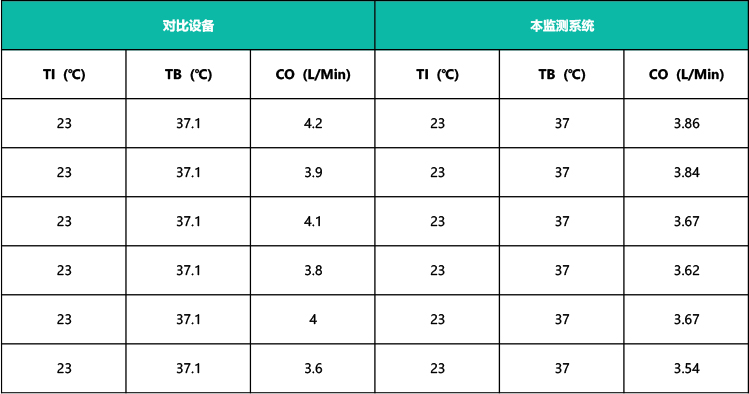 本系统通过大量临床试验,验证系统,保证系统测量具备一线水平的准确性,临床验证实验中,利用某知名公司的在线产品作为参比设备,参比设备选择要求是设备支持标准热稀释法间歇性测定心排量。由于测定心排量的特殊性,两种设备不能完全同步测定。因此,利用本系统和参比设备交替分时测定受试对象,记录数据,记录本系统的所有状态和数据。
