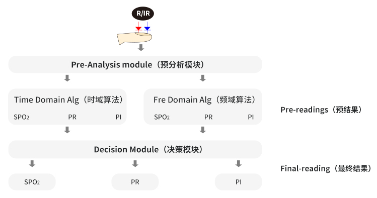 LowPulseStr™ 动脉氧饱和度技术包括时域计算,频域计算,决策计算三大计算引擎。时域算法具有快速、实时的特点,可以在各种监测环境下快速计算血氧测量结果,为医护人员提供快速准确的脉搏氧饱和度参考为目标;频域算法具有抗干扰能力的特点,在复杂环境下,如急救、新生儿监护等环境,能够尽可能排除干扰提供可靠的测量结果,为医护人员在复杂环境对病人状态做出准确的判断提供有力支撑。