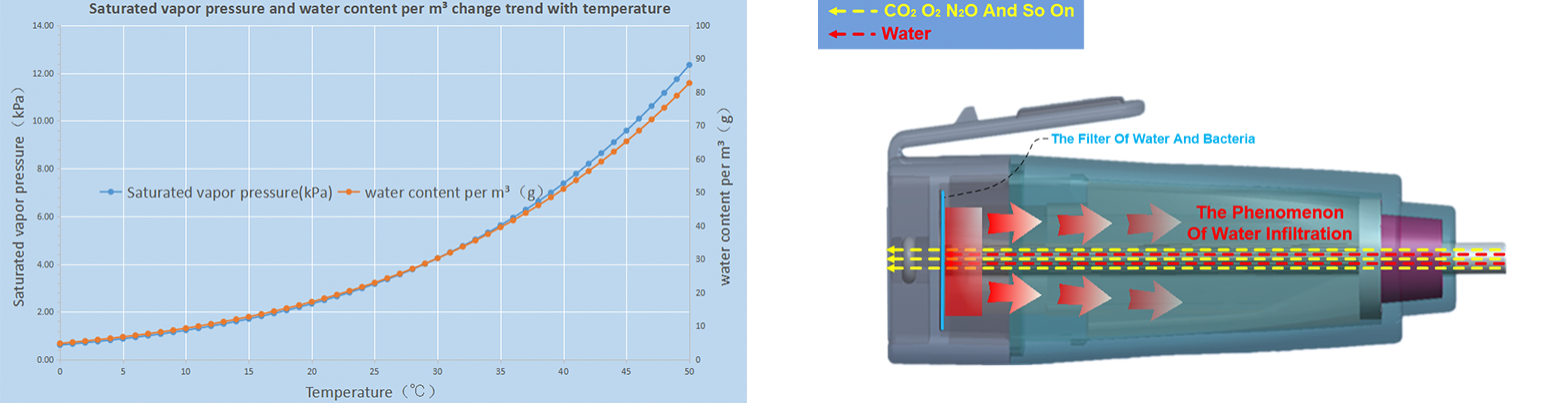 Tiniline®是采用微流的方法采样得到的呼吸气体是人体体温饱和蒸气压下的呼吸气体,当环境温度低于人体体温时,采样气体会产生冷凝水凝结于采样管管壁上,当水量达到一定程度时水滴会随着采样气体的移动方向进行移动。