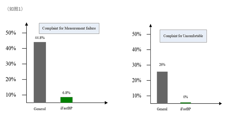 智能充气技术预判定当前患者的血压范围设定本次测量的预充气压力,以防止当前病人血压过高预充气袖带压无法压迫动脉搏动的情况以及病人血压过低袖带压远远超出压迫动脉搏动所需压力的情况,从而单次充气即可达到最优预充气袖带压力,提升测量速度与使用舒适性的目标。 智能放气技术以及智能化包络提取技术实时探测当次血压测量过程中的运动干扰状态,预充气压力符合性状态,动态调整放气台阶的时间以获得更加精准的动脉搏动包络图,减少了临床应用时的测量失败的情况。 临床数据研究表明,iFastBP®智能测量技术有效的减少了临床客户抱怨,提升了使用满意度(如图1所示)。