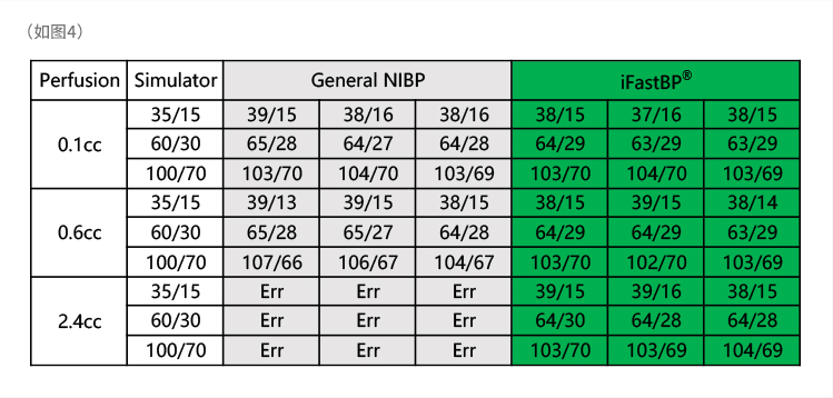 如图4所示,在患者弱灌注的情况下,iFastBP®能够保持更加精准的精确度及可测性。