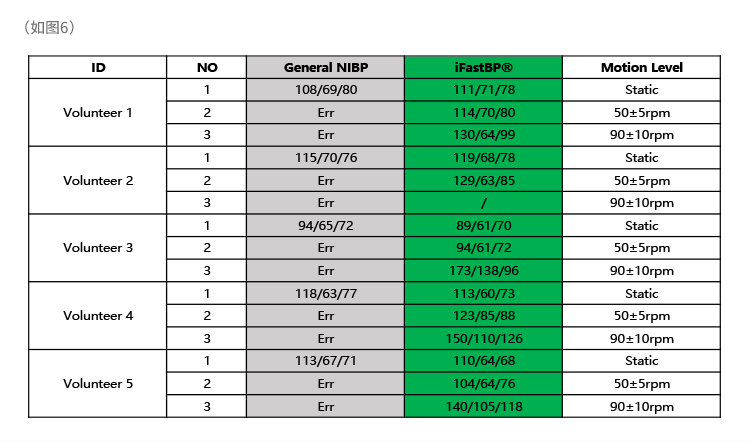 给在临床实践中的床旁监护,运动监护,遥测监护,查房监测以及新生儿及儿童监护的需求提供了更加可靠及准确的测量。通过iFastBP®与常规血压监测的交叉比对,其临床应用实践获得良好的反馈(如图6所示)。